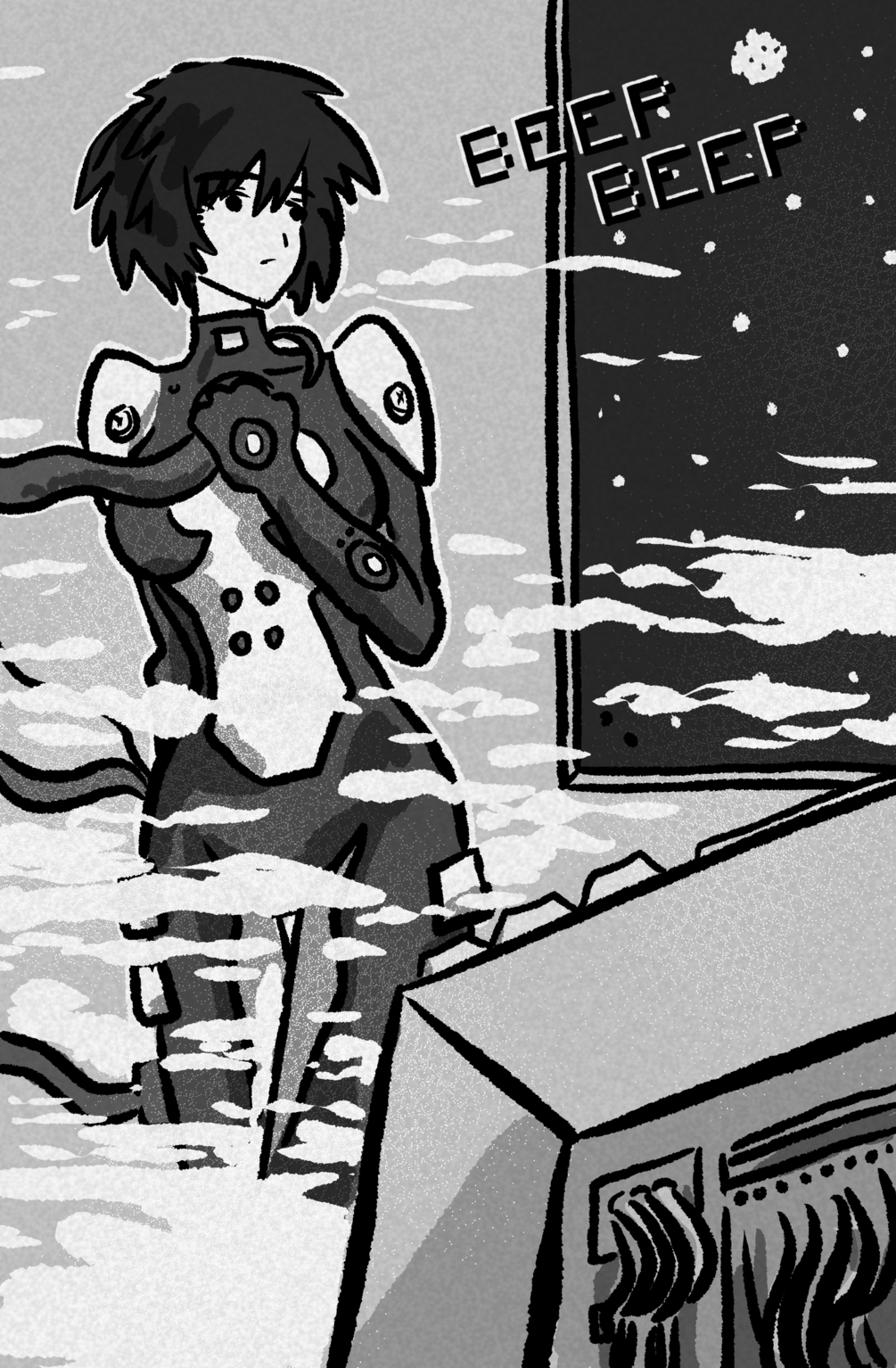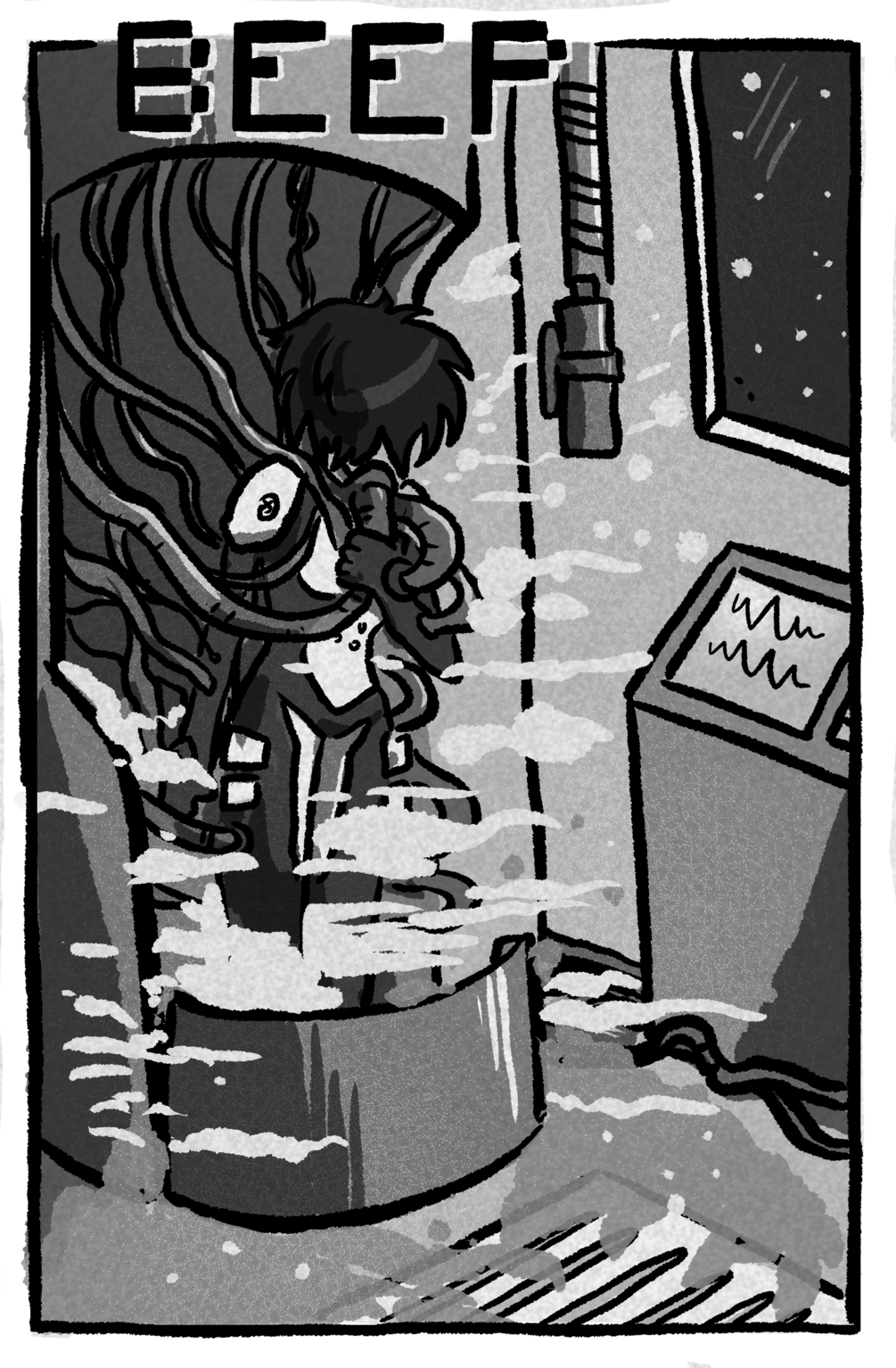 Norea is a mechanic on a spaceship and is woken up to fix an issue on the ship. This is a horror story about isolation and learning to live with the noise. 24 pages - made June 2025.